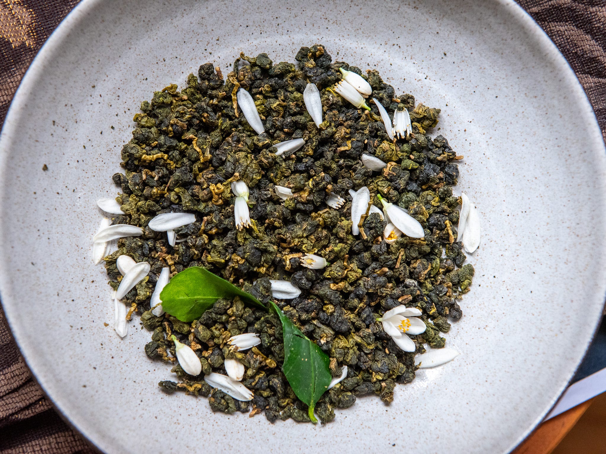 I’m scenting a small batch of Eco-Cha’s high mountain Lishan oolong, grown at 2,000 meters and made this past winter. The tea has a powerful floral and herbaceous character. My calamansi blossoms will add layers of neroli, sundried tomato, and citrus musk. Scenting is in progress and should be complete in a couple weeks as my tree’s buds come into bloom. I expect the tea will go through four or five rounds of scenting during this period. Citrus-blossom-scented teas are rare on the Western market and even more rarely made with leaf material of this quality. These blossoms aren’t sprayed with pesticides either, which sets them apart from many of the flowers used for scenting.